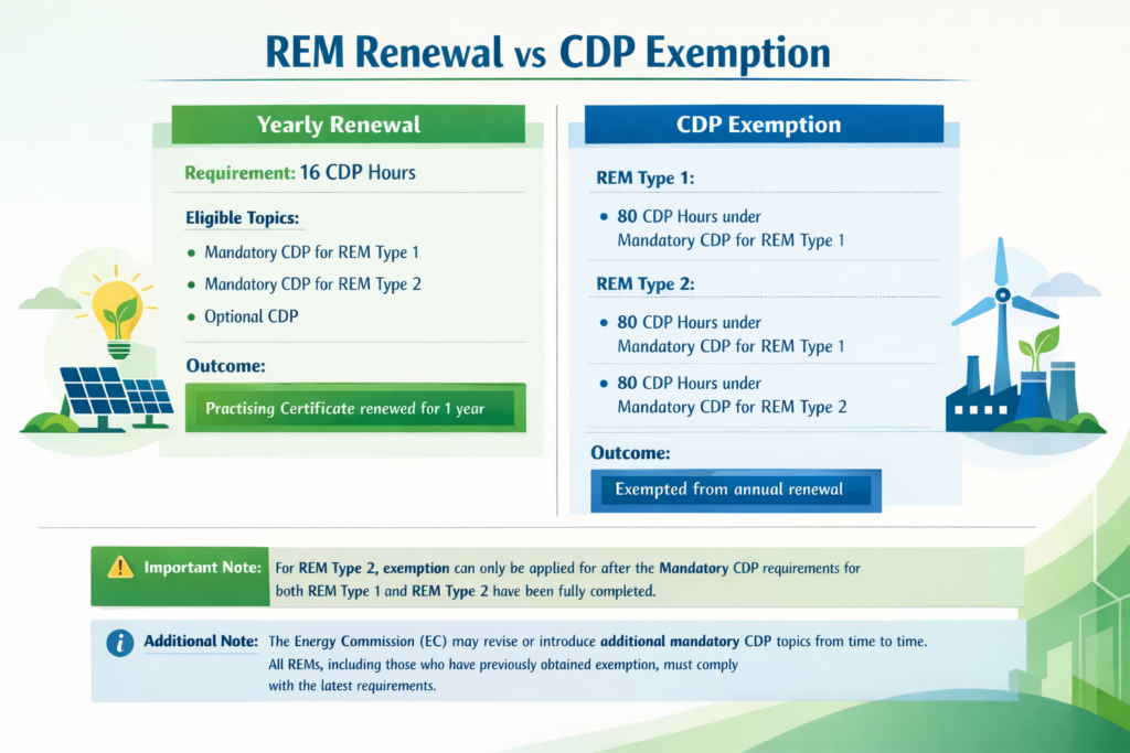 The difference is that yearly renewal requires a REM to continue renewing the practising certificate every year by completing the required CDP hours, while CDP exemption allows the REM to be exempted from annual renewal once the mandatory CDP requirements set by the Energy Commission (EC) have been fulfilled.
