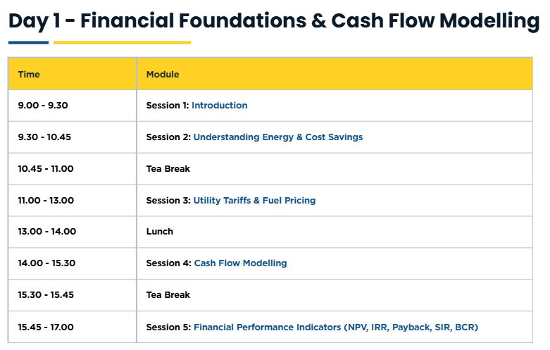 nergy efficiency (EE) investments increasingly require strong financial and carbon justification to compete with production upgrades, automation initiatives, and digital transformation projects. However, many EE proposals struggle to secure approval due to limited understanding of financial appraisal techniques, complex electricity and fuel pricing structures, and the absence of robust cash flow modelling.